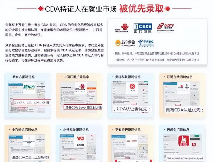 CDA企业认可度非常高,很多企业招聘时明确注明“CDA持证人优先”。中国联通、央视广信、德勤、苏宁等企业,不仅将CDA持证人列入优先考虑范围,还对员工参加CDA考试给予补贴。