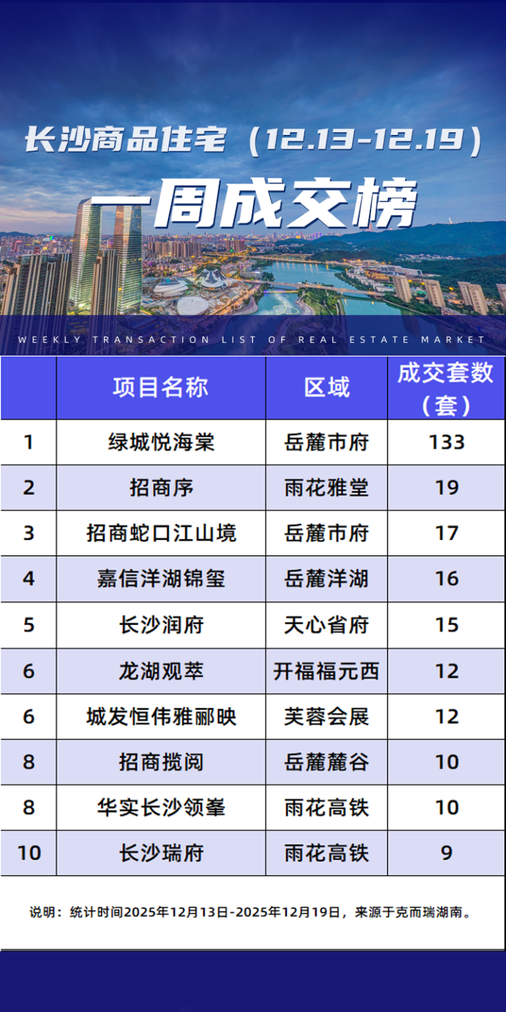 12.13-12.19,长沙内五区哪些楼盘网签成交套数更多?根据克而瑞湖南发布的内五区(含高新区、长沙县托管区域)商品住宅成交榜单显示,绿城悦海棠、招商序、招商蛇口江山境、嘉信洋湖锦玺、长沙润府、龙湖观萃、城发恒伟雅郦映、招商揽阅、华实长沙领峯、长沙瑞府等10个楼盘上榜。榜首成交套数133套,第十名成交9套。