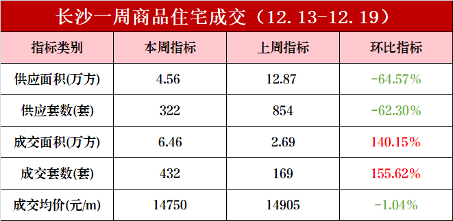 新房市场方面,上周(12.13-12.19)长沙内五区(含高新区、长沙县托管区域)一手住宅成交432套、4.56万方,成交均价14750元/㎡。供应上,一手住宅新增供应322套、4.56万方。