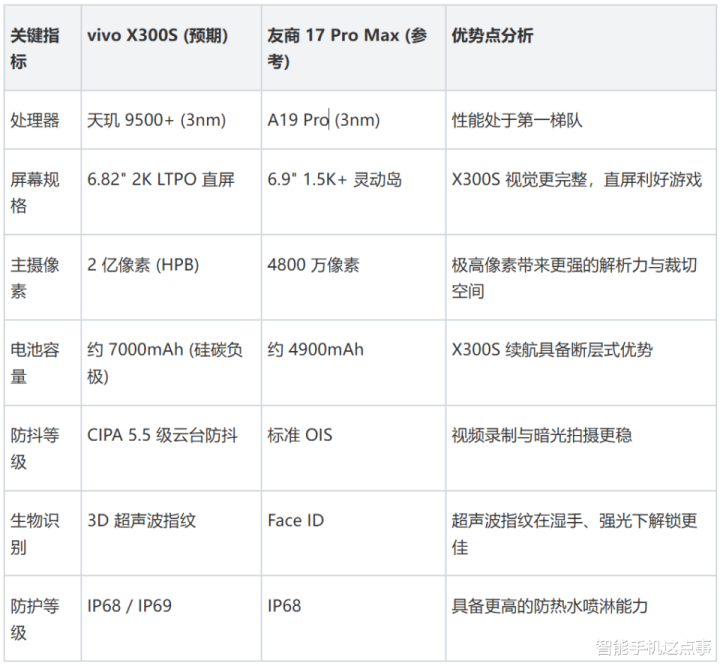 为了更直观地展示vivo X300S的竞争力,笔者将其核心参数与预期对标的友商MAX机型进行了对比: