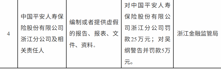 8月19日,国家金融监督管理总局浙江监管局行政处罚信息公开表显示,中国平安人寿保险股份有限公司浙江分公司及相关责任人因编制或者提供虚假的报告、报表、文件、资料被罚款25万元,对吴某警告并罚款5万元。