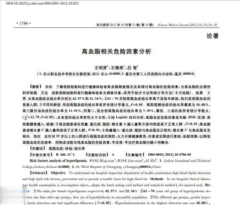 参考文献[1]王明贤,王燎原,吕智.高血脂相关危险因素分析[J].四川医学,2012,33(10):1786-1788.
